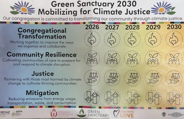 The graphics below show the elements of the GREEN SANCTUARY 2030: MOBILIZING FOR CLIMATE JUSTICE program and a scorecard poster we can put up in the sanctuary for all to see and partake in as our climate justice actions progress.