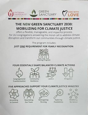 The revitalized UUA’s Green Sanctuary 2030: Mobilizing for Climate Justice, offers a flexible, manageable, and impactful process to transform our congregations through climate justice.